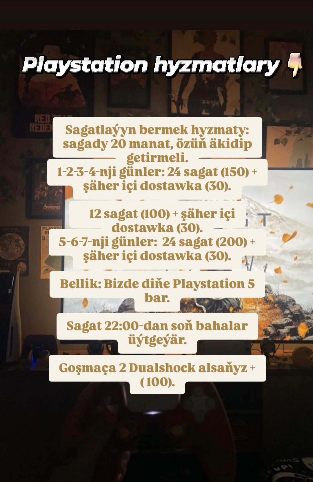 2 gün öňPlaystation 5 prokat 2 gunlik alana 1 gun mugt 1,2,3,4 gunleri - 150 m...