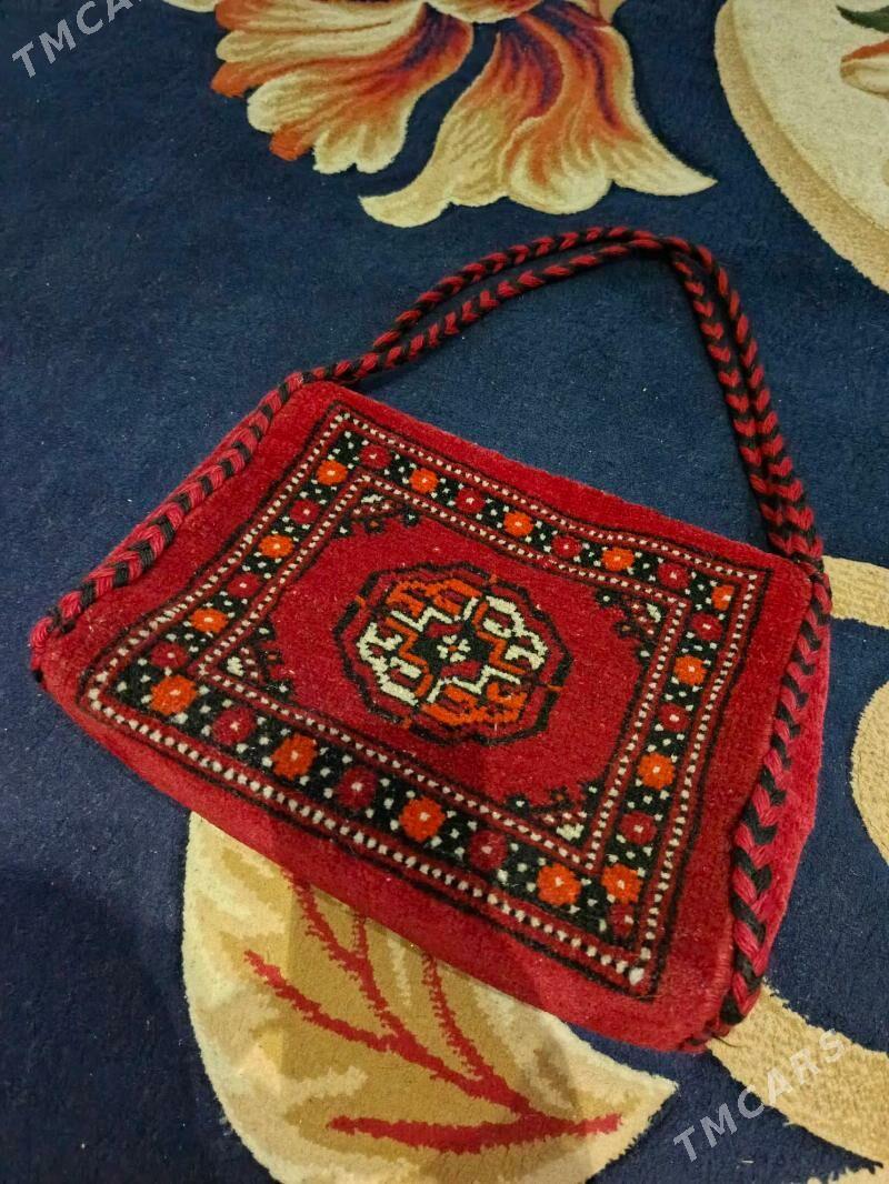 2 sag öňbiraz ullanylan, yüñden elde dokalan gyzyl haly sumka, yaşyl reñkde ka...