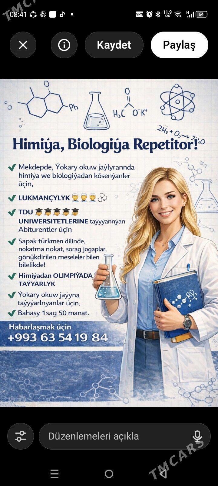01.02.2026Salam doganlar. Himiýadan we biologiýadan okadýan öýüňize baryp. Mekd...