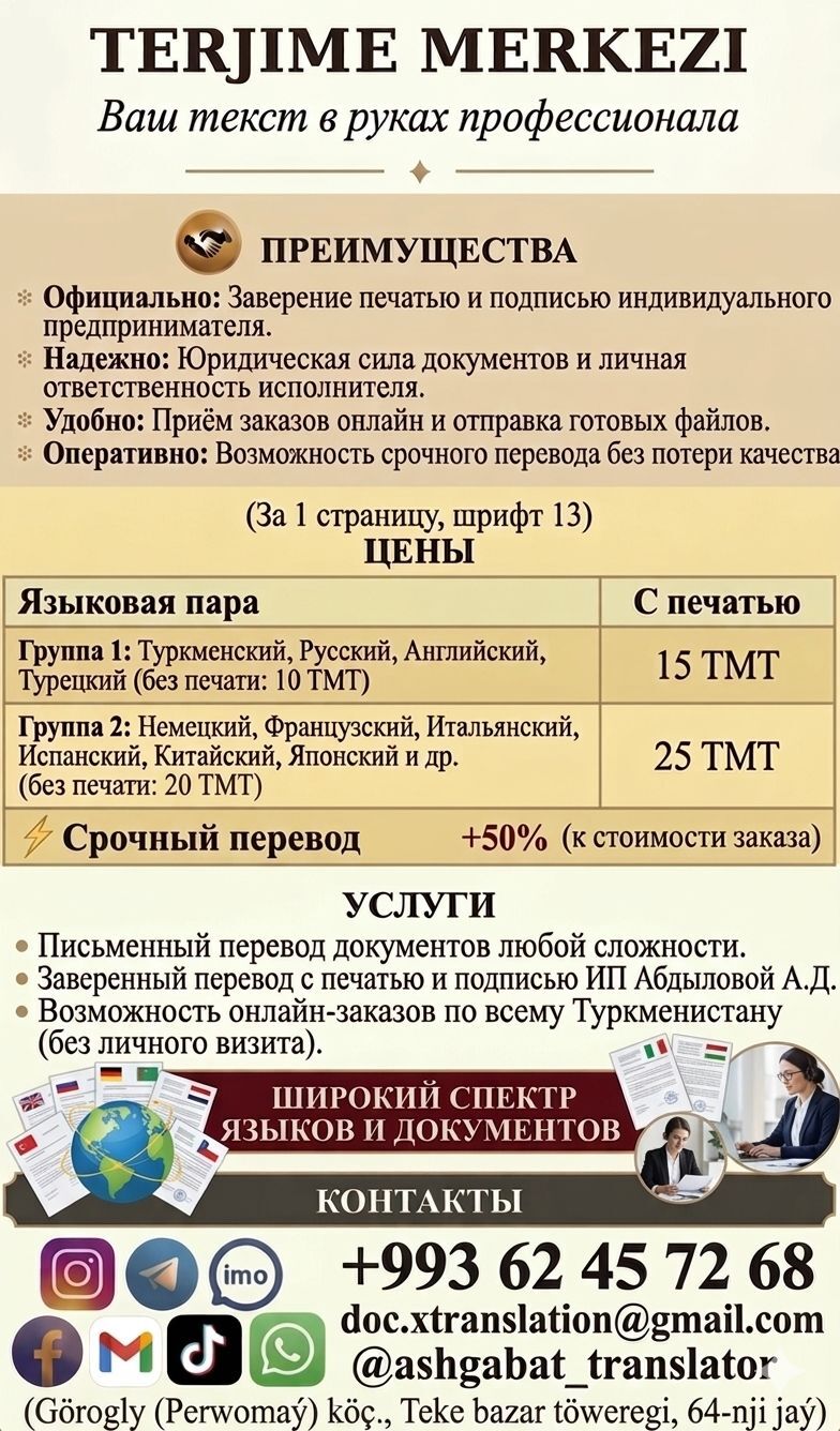 11 sag öňПереводы документов, статей, лекций,книг на туркм/русск языки. Качест...