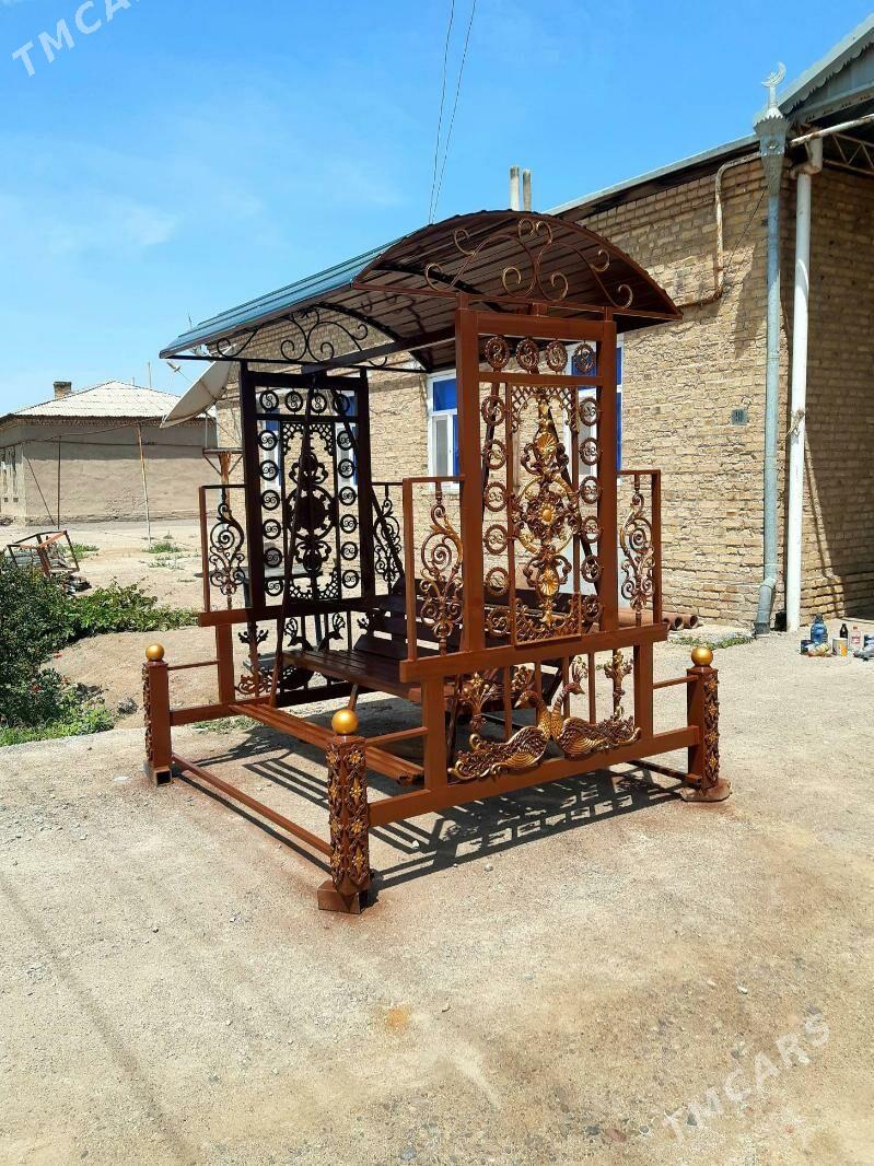 2 sag öňuly sallancak 3 adam arkayyn yerlesya galyn materiyaldan yasalan baha ...