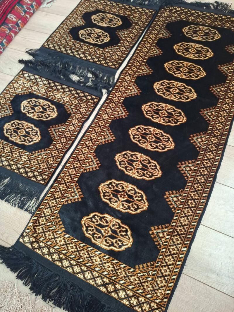 Arassa gülýüpekden elde dokalan, düşegi gara reňkli, göl-nagyşlary altynsöw-golden reňkli, iki taraplaýyn öwüsýän-hameleon, akyp duran maşyn haly, täze.