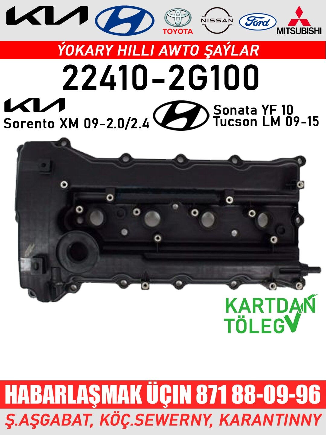 Part no: 22410-2G100 Деталь: Крышка клапана Для: HYUNDAI Sonata 10, Tucson 0=15; KIA Sorento XM 09-2.0/2.4 Part no: 22410-2G710 Деталь: Крышка клапана Для: HYUNDAI K5 (USA) 10; Sonata 10; KIA Sorento XM 12-2.0T Part no: 22410-23010 Деталь: Крышка клапана Для: Hyundai Coupe 96-01; Elenatra 95-00 Part no: 22410-2B800 Деталь: Крышка клапана Для: Hyundai Accent/Solaris; Elantra MD 11- Part no: 22410-26635 Деталь: Крышка клапана Для: Hyundai Accent/Getz 06- 1.6 Part no: 22410-25100 Деталь: Крышка клапана Для: KIA Cares 06-12; Hyundai Sonata 09- Part no: 22410-23100 Деталь: Крышка клапана Для: KIA Sportage 04- 2.0; Hyundai Tucson Part no: 22410-2E700 Деталь: Крышка клапана Для: KIA Cerato, Forte; Hyundai Elantra 18, Kona 18, Seltos Part no: 22410-26640 Деталь: Крышка клапана Для: KIA Rio 06; Hyundai Accent Durli gornusde original detallary bizin dukanymyzdan tapyp bilersiniz ✅ Kartdan töleg 📱 +99371 88-09-96 🛍️ ş.Aşgabat, köç.Garantiýni