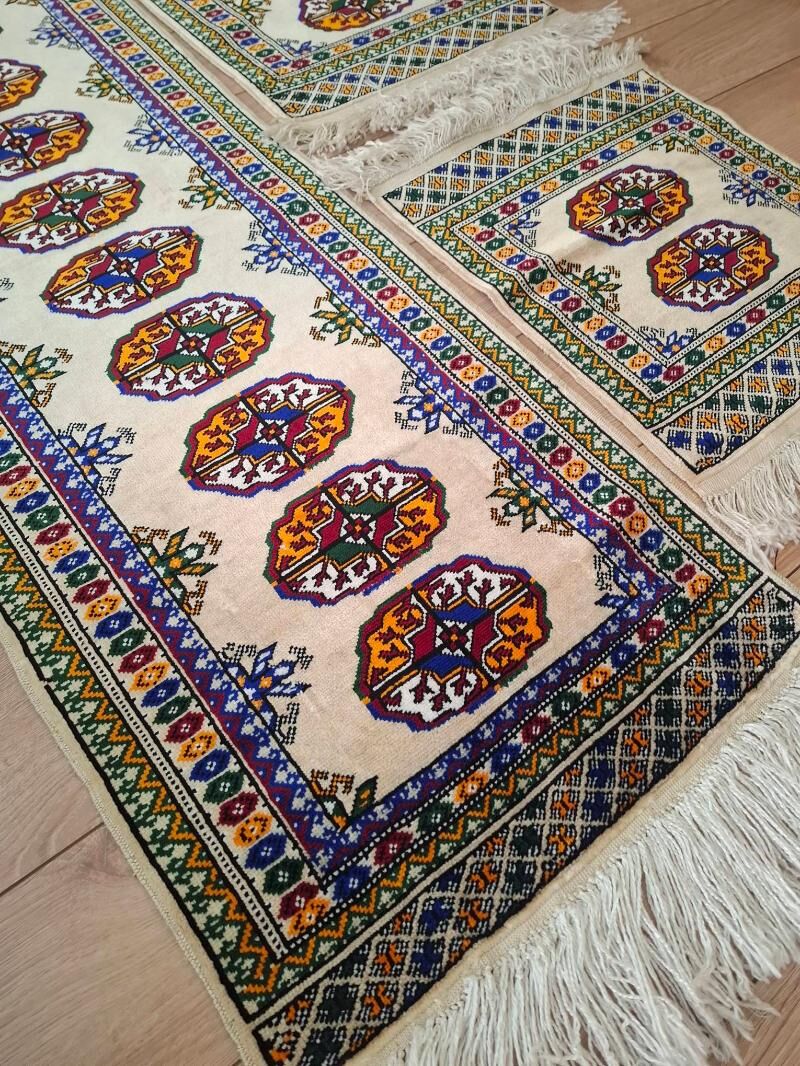 Arassa gülýüpekden elde dokalan, açyk sary-bež reňkli, iki taraplaýyn öwüsýän-hameleon, owadanlygy gözüň köküni iýip barýan, akyp duran maşyn haly, täze.