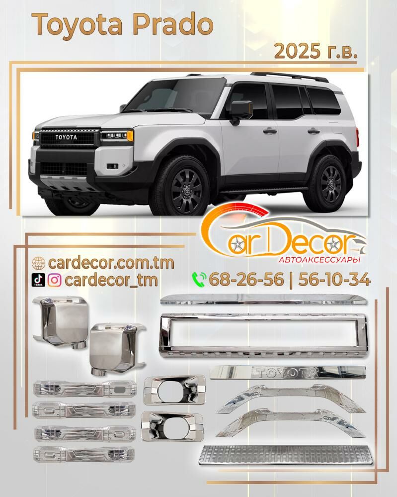 Hormatly müşderiler, biz Size Car Decor (awtobezegleri) dükanymyzda Toyota Prado 2024-2026ýý. degişli bezegleri Size hödürleýäris. Dükan salgymyz: Mir 2-däki "FOK-yñ" gabadyndaky, awtoduralgañ 1-njy gaty. Gurnama ussahanamyz: 9-njy mikraýon, "Mitsubishi" sentr. Tiktok: cardecor_tm Instagram: cardecor_tm Saýt: cardecor.com.tm