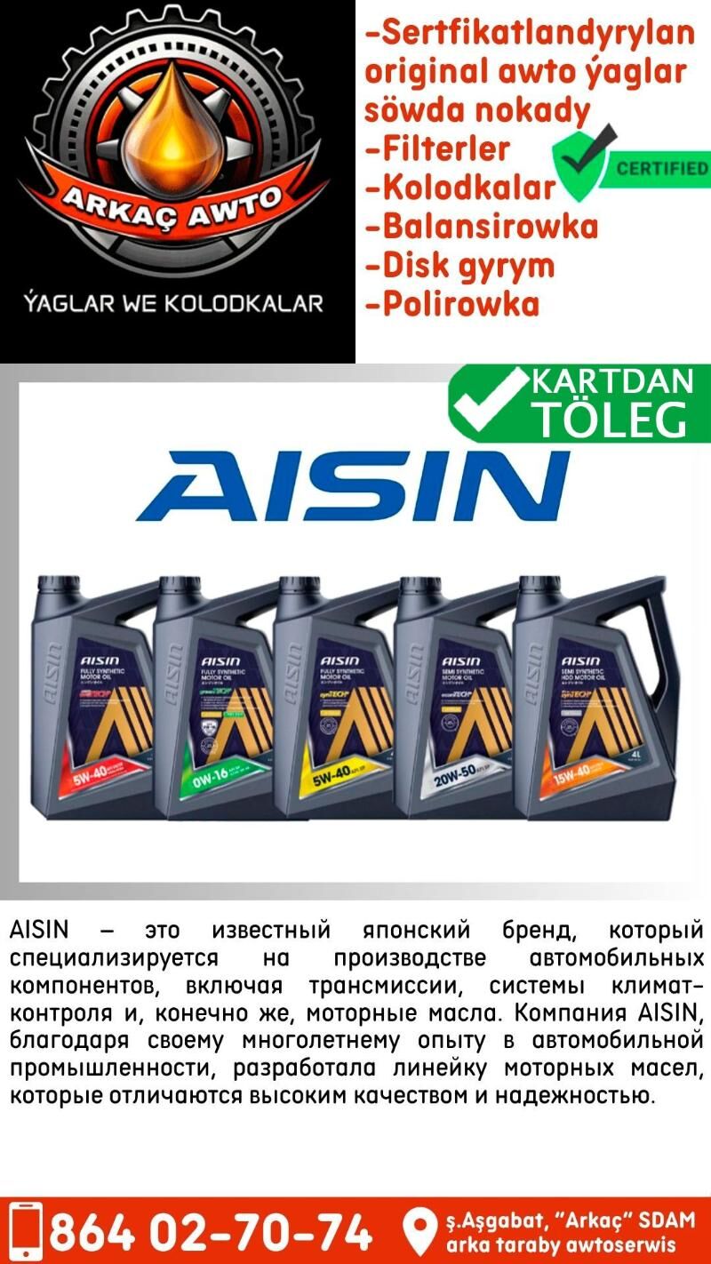 AISIN YAPON yaglary Масло AISIN – это известный японский бренд, который специализируется на производстве автомобильных компонентов, включая трансмиссии, системы климат-контроля и, конечно же, моторные масла. Компания AISIN, благодаря своему многолетнему опыту в автомобильной промышленности, разработала линейку моторных масел, которые отличаются высоким качеством и надежностью. Почему стоит выбрать моторные масла AISIN? Японское качество: Масла AISIN производятся в соответствии с высочайшими стандартами качества, которые характерны для японской промышленности. Инновационные технологии: Компания AISIN постоянно внедряет новые технологии в производство своих масел, что позволяет создавать продукты, отвечающие самым современным требованиям автомобильных двигателей. Широкий ассортимент: В линейке масел AISIN представлены продукты для различных типов двигателей: бензиновых, дизельных, легковых и грузовых автомобилей. Соответствие международным стандартам: Масла AISIN соответствуют всем необходимым международным стандартам качества, таким как API, ACEA и ILSAC. Оптимальная защита двигателя: Масла AISIN обеспечивают надежную защиту двигателя от износа, коррозии и образования отложений. Снижение расхода топлива: Многие масла AISIN обладают энергосберегающими свойствами, что позволяет снизить расход топлива. Улучшение производительности двигателя: Масла AISIN способствуют улучшению динамических характеристик двигателя и повышению его мощности. 👌Сертифицированная точка продажи Yaponiyada yasalan Сделано в Японии "ARKAÇ AWTO ÝAGLAR WE KOLODKALAR" ýag we kalodka çalyşmak hyzmaty Biziň dükanymyz Size amatly bahadan ýokary hilli harytlary we hyzmatlary hödürleýär. Harytlar: 👉Awto ýaglar 👉Filterler 👉Kalodkalar Hyzmatlar: 👉Mator ýag çalyşmak 👉Kalodka çalyşmak 👉Supportlary ýaglamak 👉Tormoz disklerini gyrmak 👉Fara polerowka etmek 👉Hadawoý bejermek Aýratynlygymyz: 💳 Kartdan töleg 👌Amatly baha we Ýokary hil 💥Multibrendlar we dürli görnüşli harytlar 🕒 Iş wagtymyz: 9:00 - 22:00 📍Biziň salgymyz: Aşgabat şäheri, Garantiyni 📱Telefon belgimiz: +99364027074