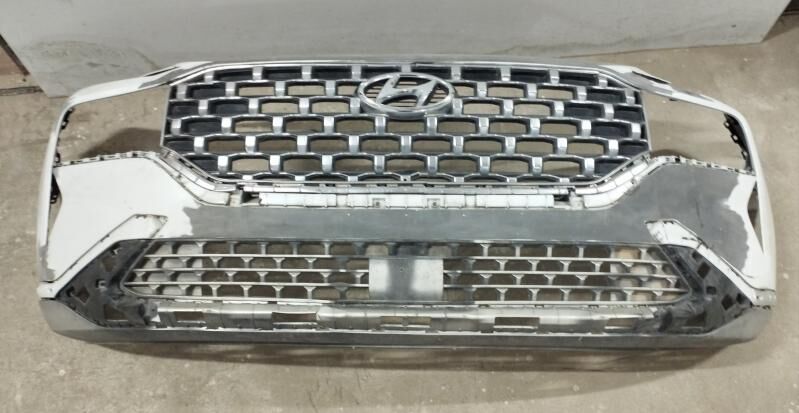 Бампер Hyundai Santa Fe 2021-2023, оригинал морда с биркой, в облицовке есть сломанные места. Bamper Hyundai Santa Fe 2021-2023 original morda, birkaly, oblisofkasynda döwük yerleri bar.