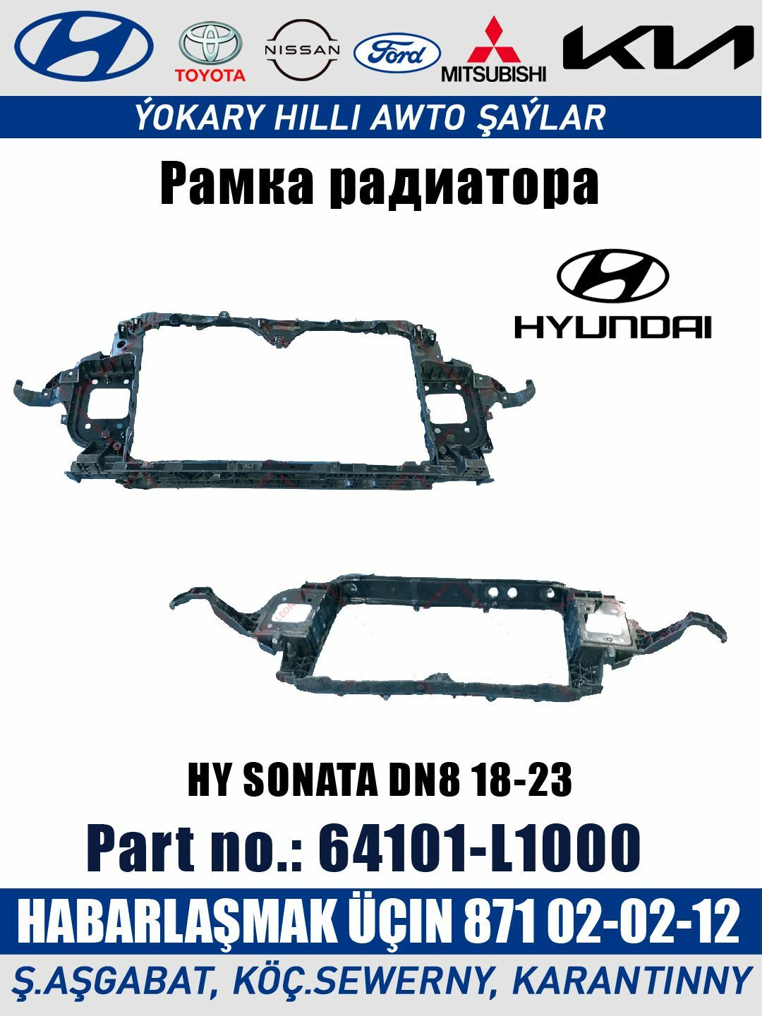 Части: Radiator ramka. Рамка радиатора Part: 64101-L1000 Model: Expert-H.P.T. No. V65856 For: HY SONATA DN8 18-23 ✅ Kartdan töleg 📱 +99371 02-02-12 🛍️ ş.Aşgabat, köç.Garantiýni