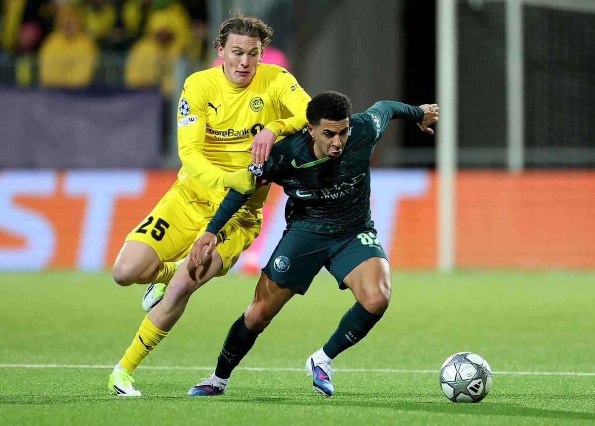 Норвежский клуб одержал первую победу на общем этапе, и обыграли при этом не абы кого, а подопечных Гвардиолы. Два мяча в первом тайме забил Каспер Хёг, а после перерыва Йенс-Петтер Хёуге довел счет до крупного. На исходе часа игры «Сити» смог ответить одним голом Райана Шерки, но сразу после этого (за две минуты) капитан «горожан» Родри умудрился дважды сфолить на желтую и оставил свою команду в меньшинстве. Хёуге был близок к тому, чтобы вновь сделать счет разгромным, но попал в перекладину.