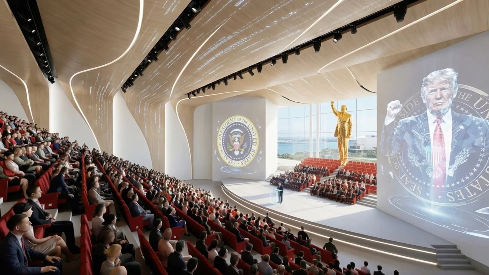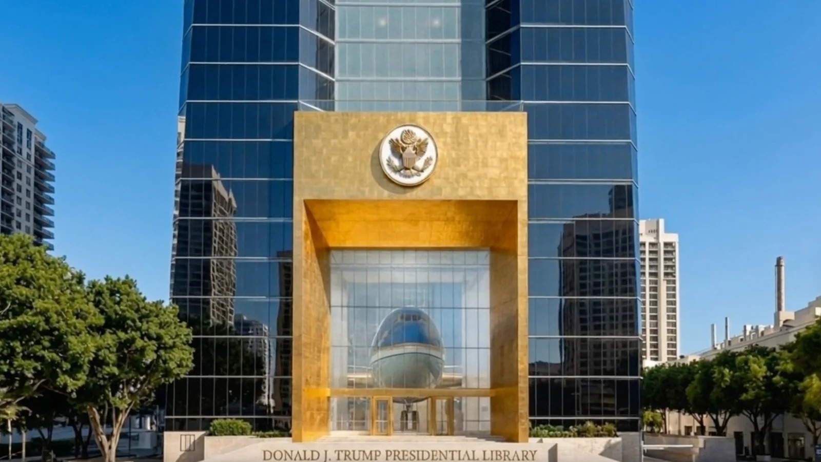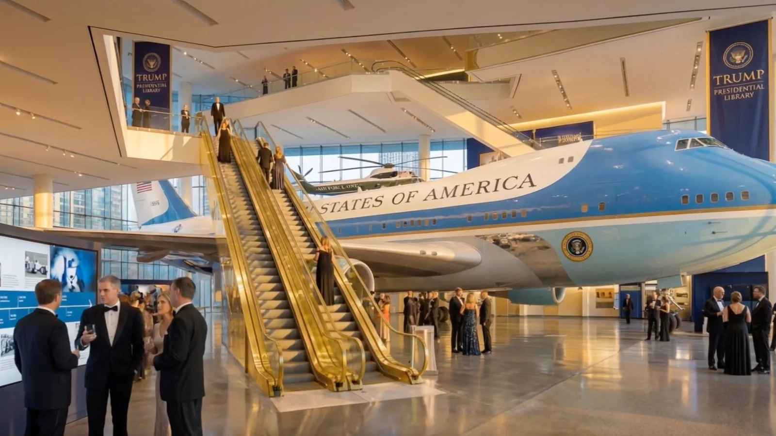 Согласно представленным материалам, в вестибюле здания планируется разместить президентский самолёт Air Force One и другие самолёты ВВС США. В одном из залов, выполненном в форме амфитеатра, предусмотрена установка большой золотой статуи Трампа. На крыше комплекса планируется создать копию сада Белого дома.