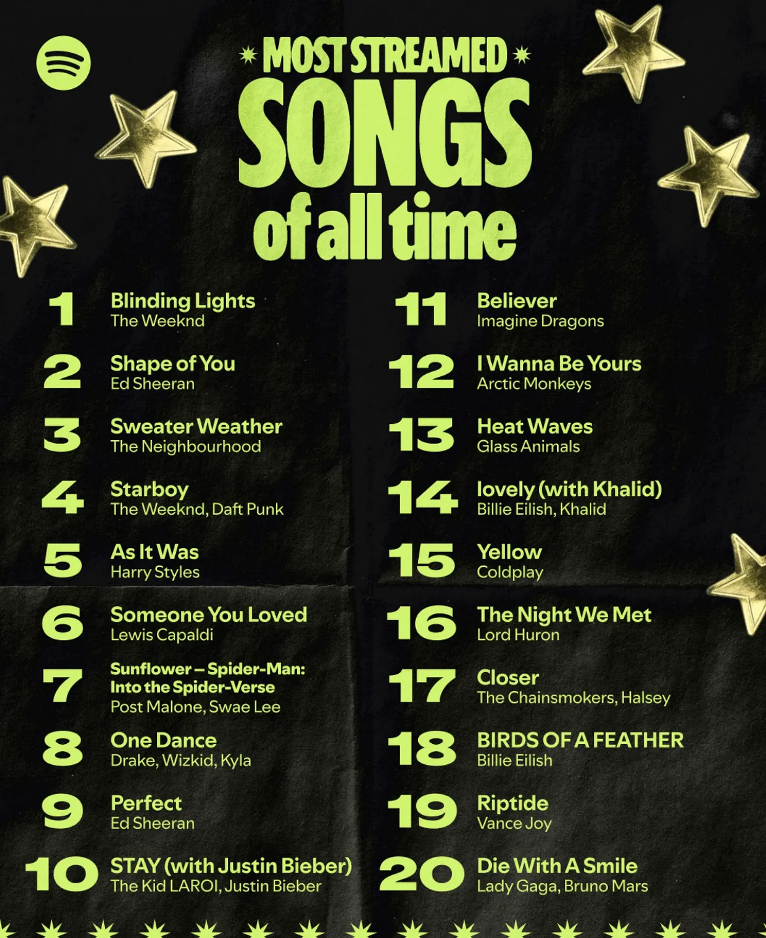 Звание самой прослушиваемой песни в истории стриминга закрепилось за треком «Blinding Lights» (The Weeknd). Вслед за ней идут «Shape of You» Эда Ширана, «Sweater Weather» группы The Neighbourhood, совместная работа The Weeknd и Daft Punk «Starboy», а также «As It Was» Харри Стайлза.