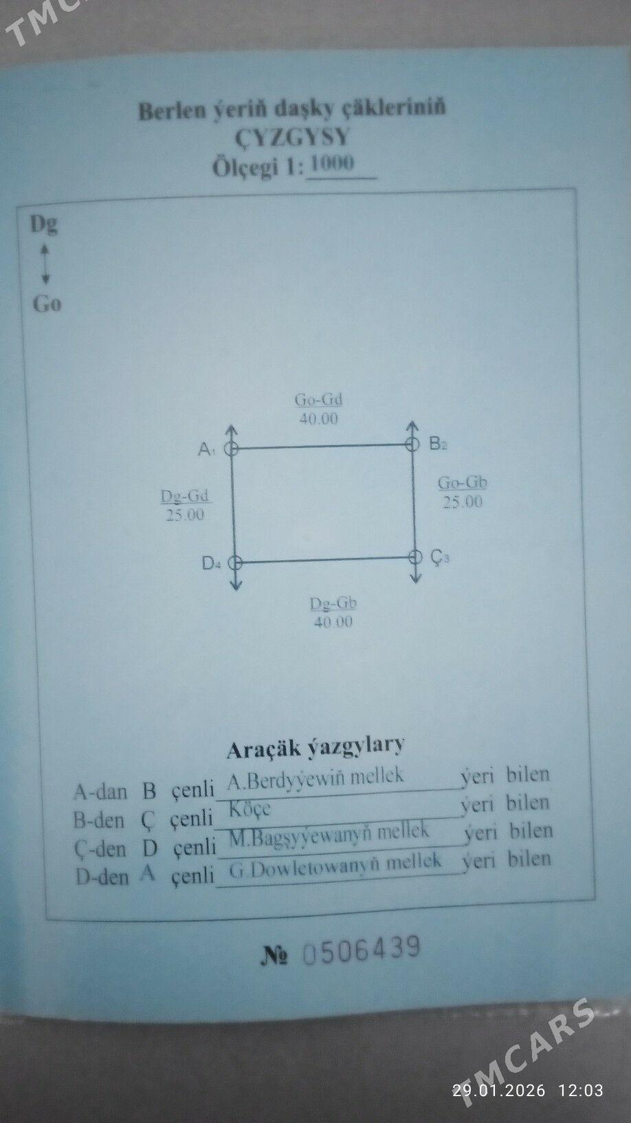 4 sag öňGyssagly satlyk Mellek, 16 sotka, dowletnama bar, yabyn boyundan 1nji ...