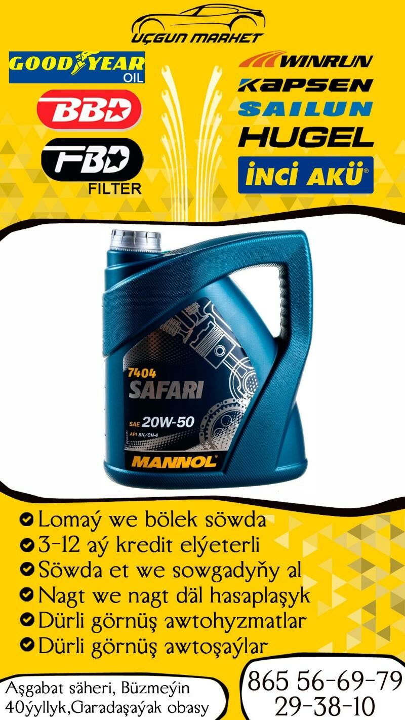 MANNOL SAFARI 20W50 ÝAGLAR BIZIN DUKANYMYZDAN TAPYP BILERSINIZ Durli brentlerin original yaglaryny amatly bahadan Size teklip edyaris. Ulaglaryn ahli gornusleri ucin yaglaryny bizden amatly bahadan alyp bilersiniz ️💥Dowik bahadan durli awtoşaýlary 🤝Lomaý we bölek söwda ⚫TikTok: avtomarket_tm2 💳Nagt we nagt däl hasaplasyklary kabul edýäris 📱Habarlasmak üçin: +99365 566979 29 38 10✅️ 📍Salgymyz: Buzmeyin, 40-ýyllyk Uçgyn Awto Hyzmatlary