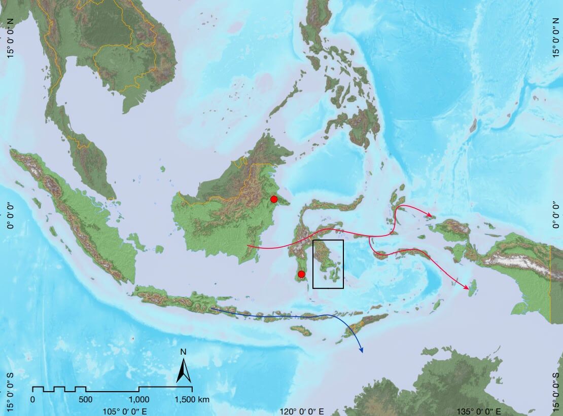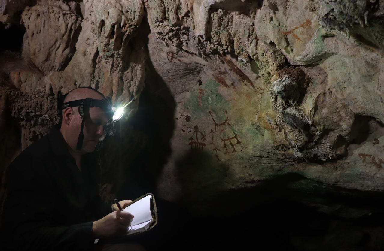 Alymlar Sulawesiniň günorta bölegindäki 44 gowagy öwrendi, olardan 14-üsi öň belli däldi. Olaryň birinde, Muna adasyndaky Liang Metanduno sebitinde, olar adam aýalarynyň töweregine çalnan boýagyň yzlaryny tapdy. Suratda inçe, uçly barmaklary bolan eliň solgun şekili görünýär.
