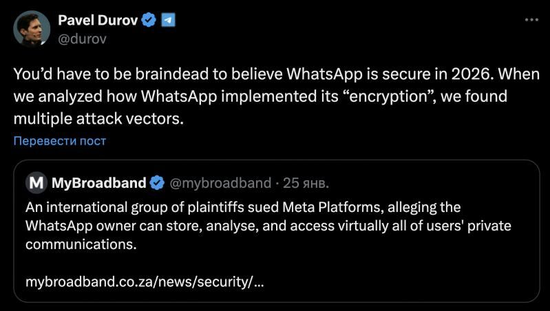 «2026-njy ýylda WhatsApp-yň howpsuzlygyna ynanmak üçin doly akmak bolmaly. WhatsApp-yň "şifrlemesini" nähili amala aşyrýandygyny seljerip, biz köp sanly hüjüm wektorlaryny tapdyk» diýip, Pawel Durow X sosial ulgamynda ýazdy.