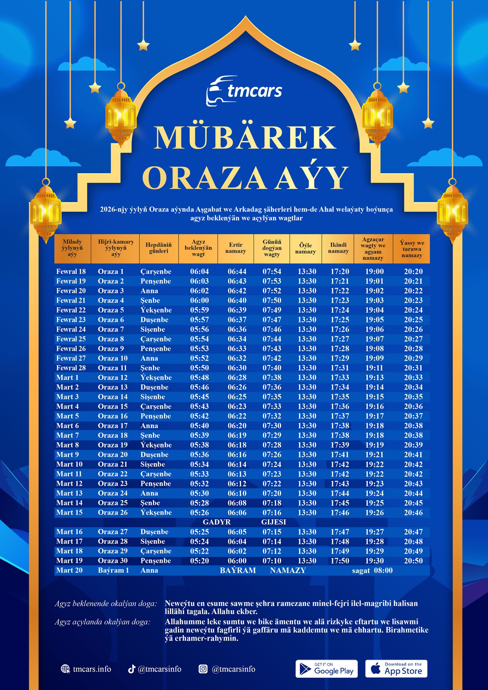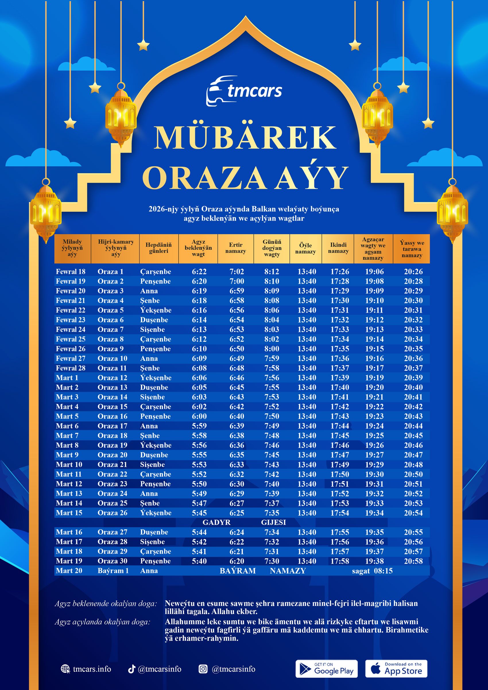 TmCars-yň adyndan ähli musulman doganlarymyza bu mukaddes aýda eden doga dilegleriňiziň, tutjak orazalaryňyzyň kabul bolmagyny arzuw edýäris!