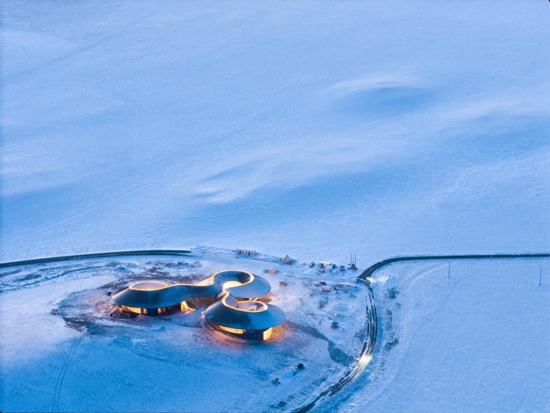 Umumy meýdany 3532 inedördül metr bolan bu bina diňe bir owadan dizaýny bilen däl, eýsem daşky gurşawy goramaga gönükdirilen inženerçilik çözgütleri bilen hem parhlanýar. Binagärler topragyň eroziýasyny saklamak we tebigy gatlagy has-da dargamakdan goramak üçin polat binýatly gurluşy ulandylar. Bu bolsa binanyň ýer bilen galtaşygyny azaldyp, ony sütünleriň üstünde ýokary göterýär. Toplumyň üç sany tegelek göwrümi we ýumşak çyzykly üçekleri sähranyň güýçli ýelleriniň täsirini azaltmaga kömek edýär. Şeýle-de, gyşyna howanyň -40°C-ä çenli düşýän bu sebitinde binanyň energiýa tygşytlaýjy aýnalar we metal örtükler bilen goralmagy aýratyn ähmiýete eýedir.